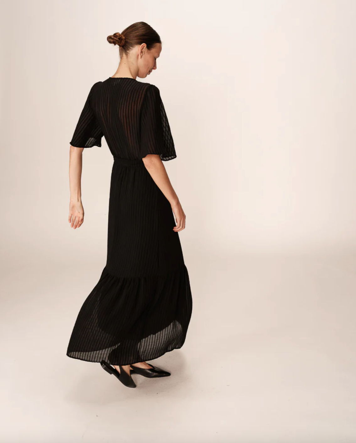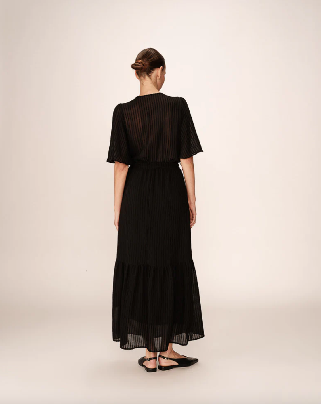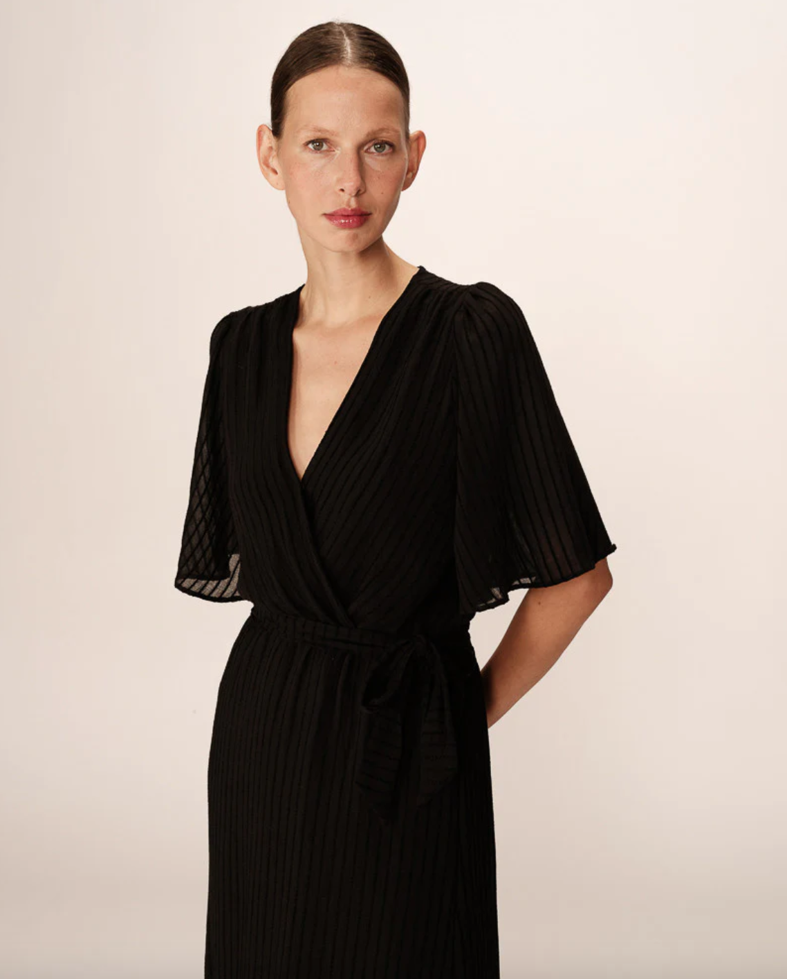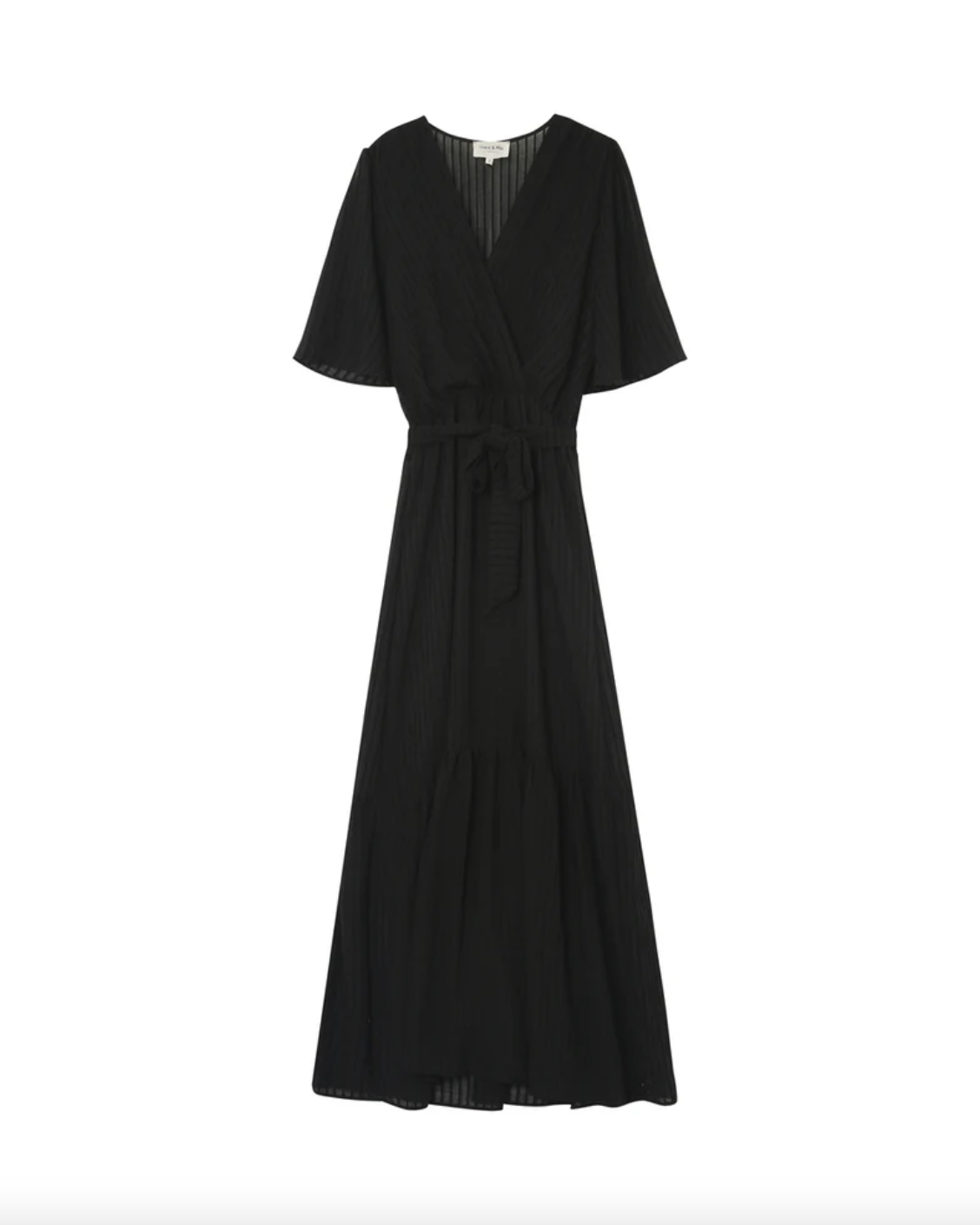 Create an accountMade from a light and fluid fabric that plays with transparency at the back and shoulders. The trapeze cut, butterfly sleeves, and cross-neckline create a timeless and elegant silhouette. The dress features ruffles at the bottom, highlighting its bohemian and romantic inspiration. The PERSE fluid dress has an elasticated waist, belt loops, and a removable belt that provide more structure