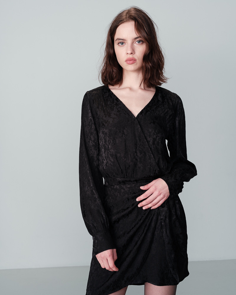 Silky, printed dress with a cross front and a tie at the waist. This is fitting a bit snug but true. No stretch to fabric.