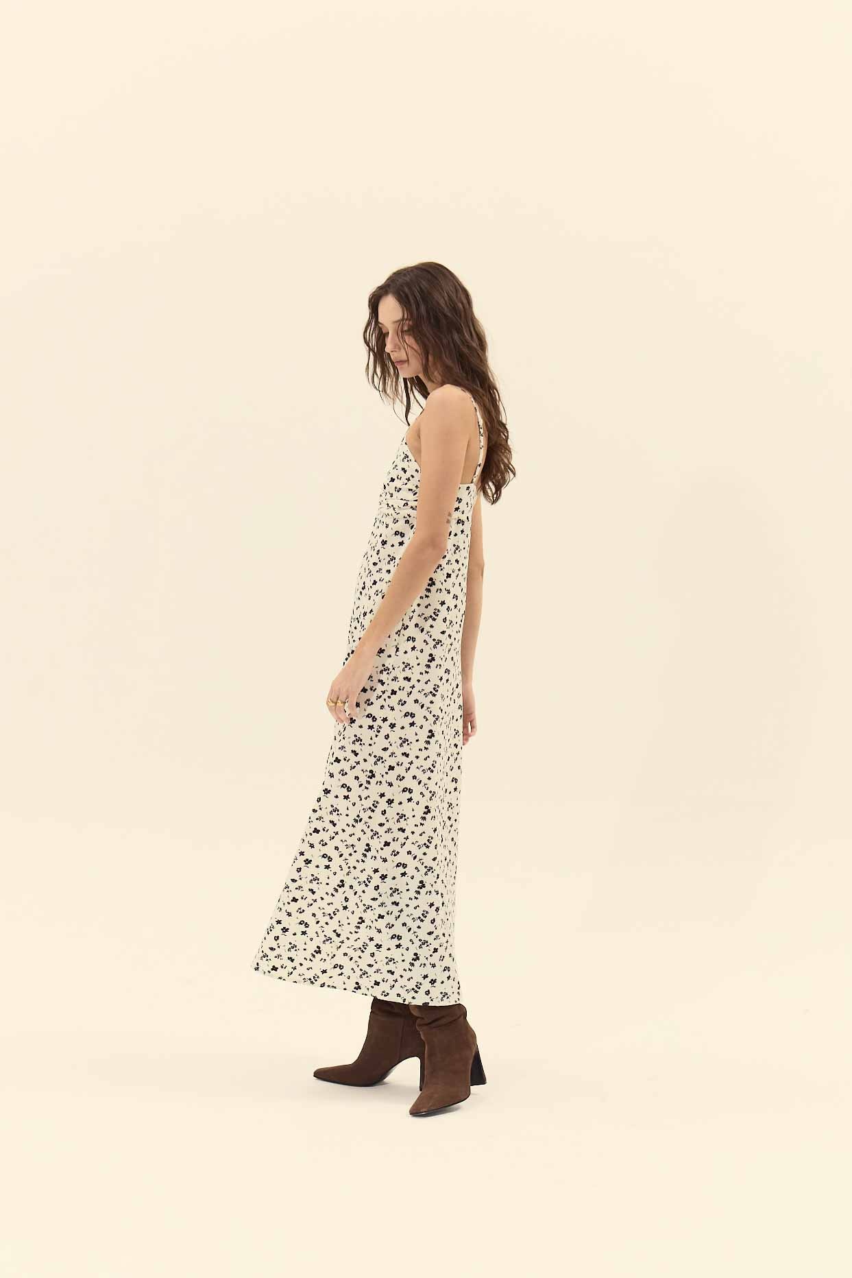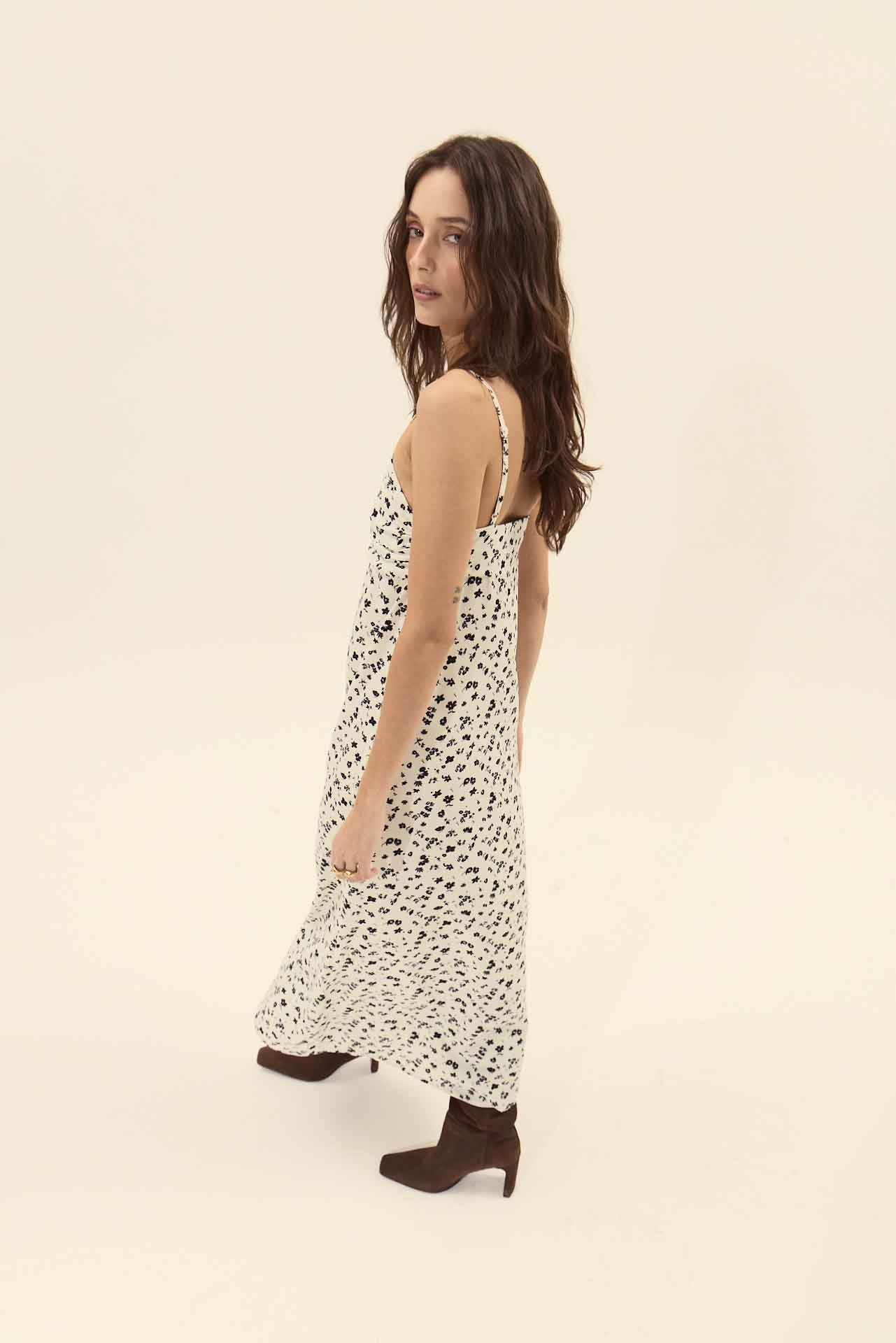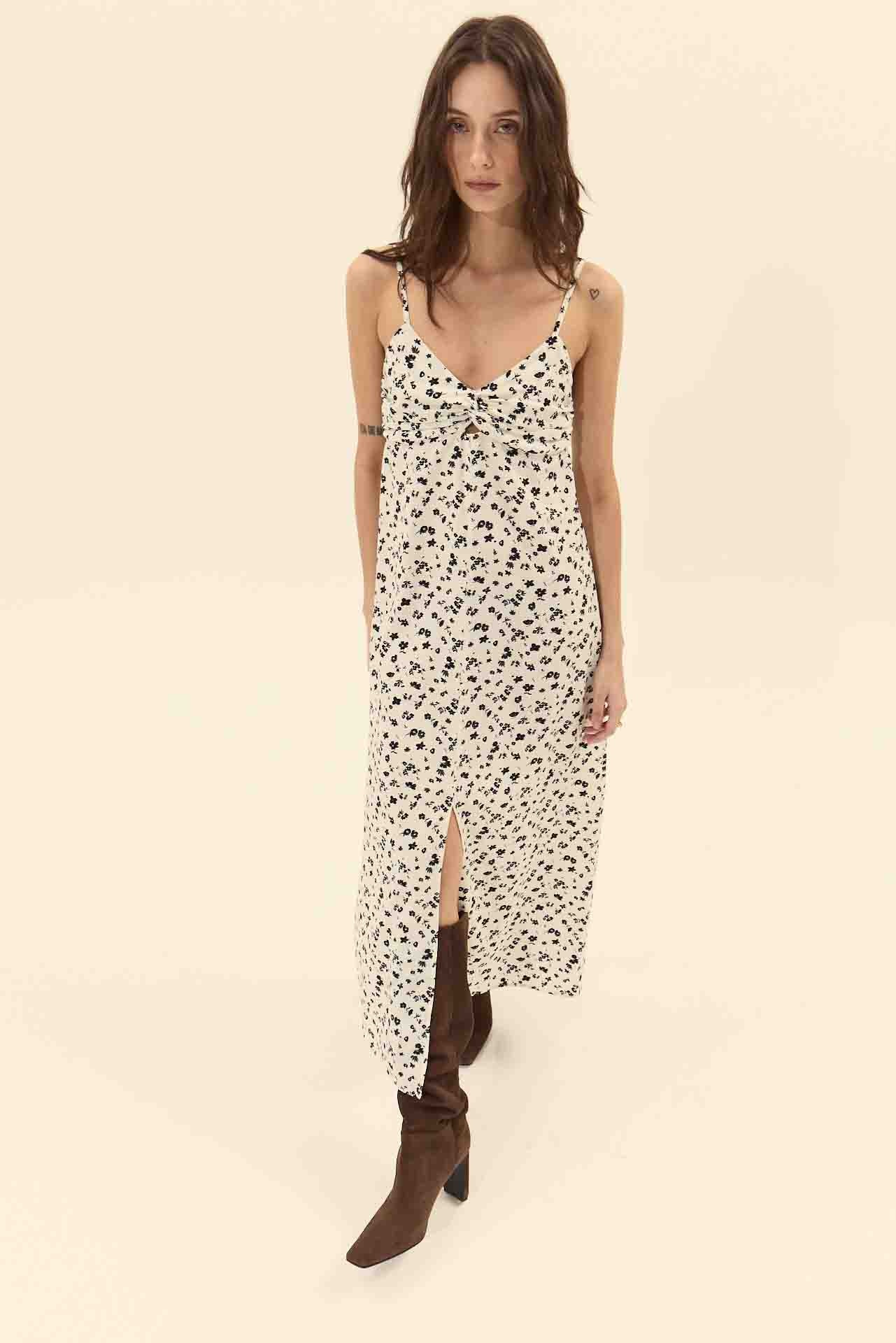 Create an accountPrinted sleeveless midi dress with a V-neckline and adjustable shoulder straps. The bust features pleated detailing twisted at the center, creating a small keyhole cutout. Made from a silky-feel fabric. Invisible side zipper closure and a front slit for ease of movement.