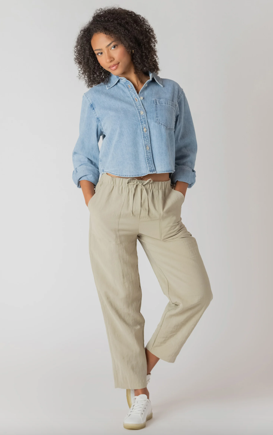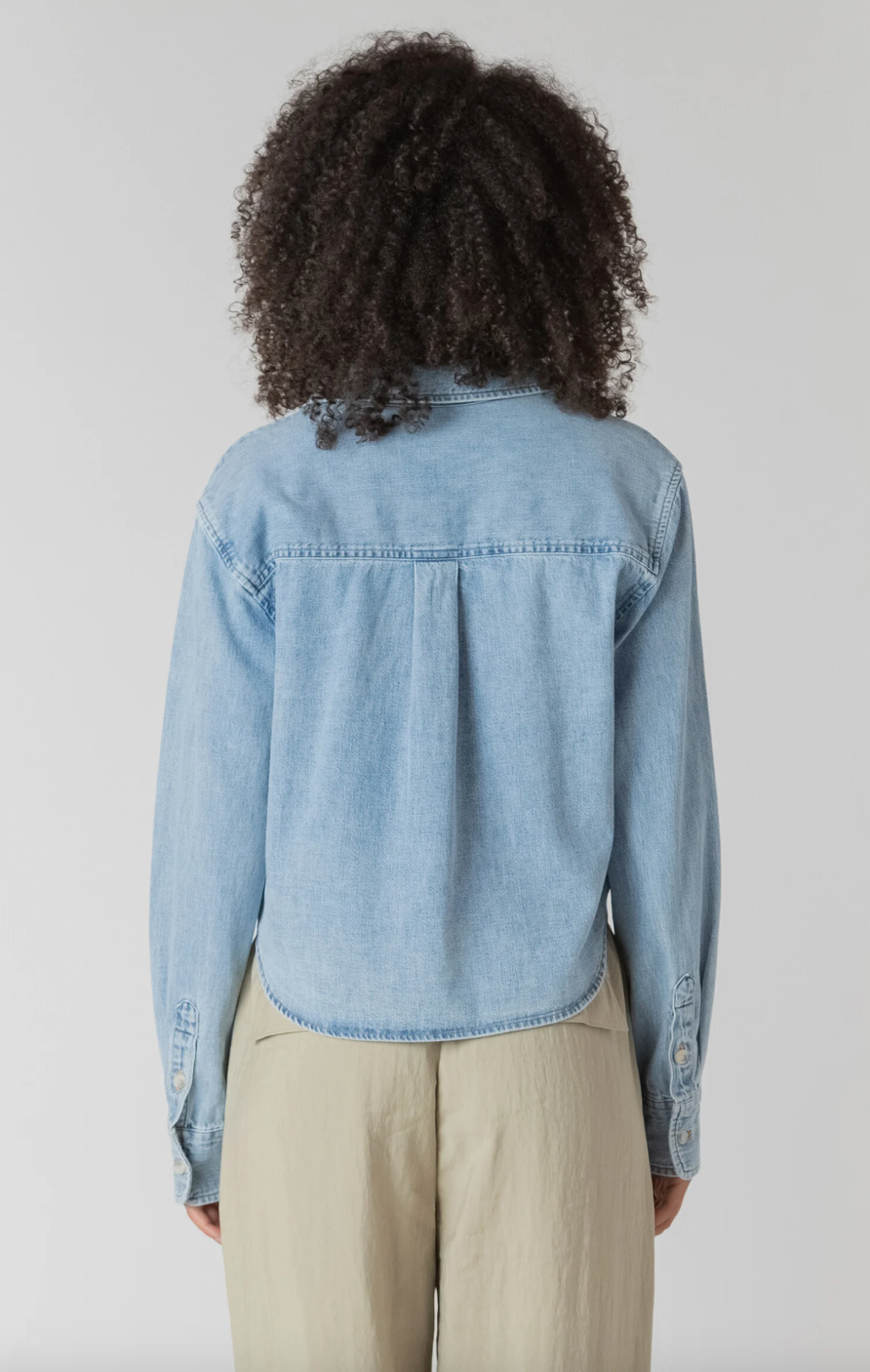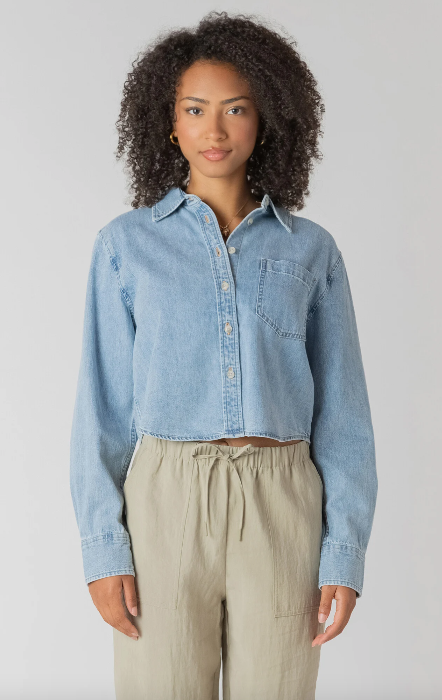Create an accountThis cropped denim button-up shirt is an easy everyday staple with a relaxed, modern fit. A soft lightweight denim, it features a classic collar, chest pocket, and clean cropped length that pairs perfectly with high-waisted bottoms.
