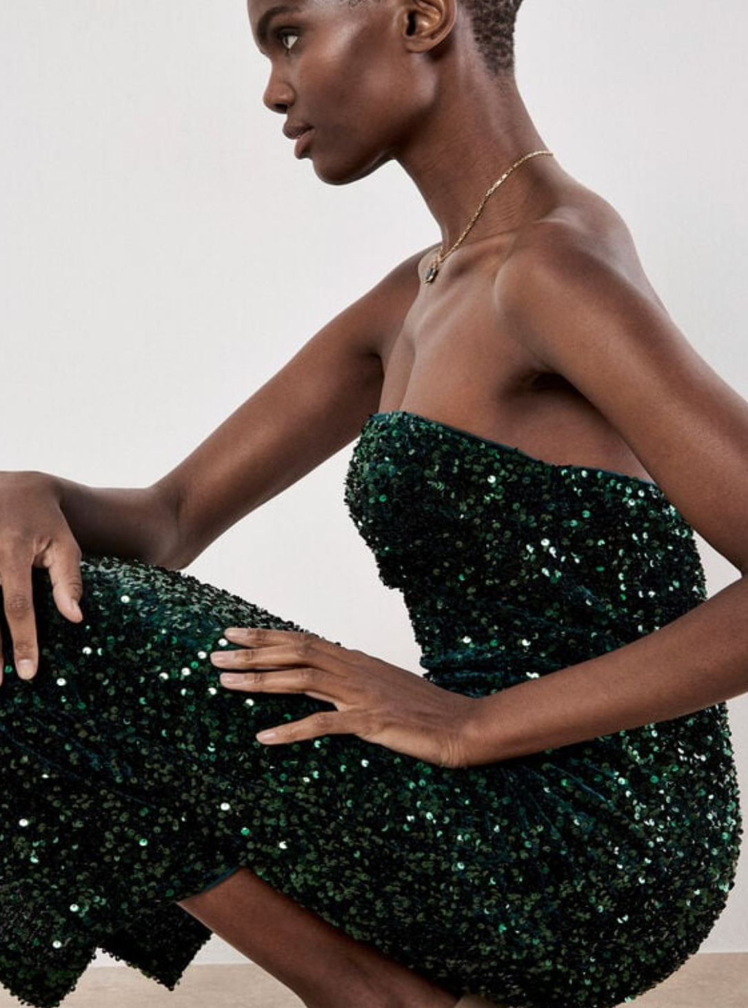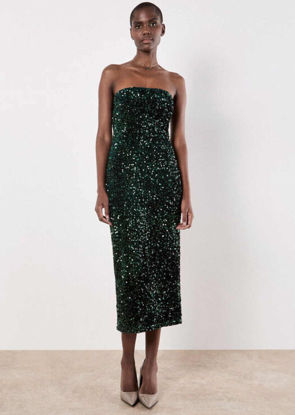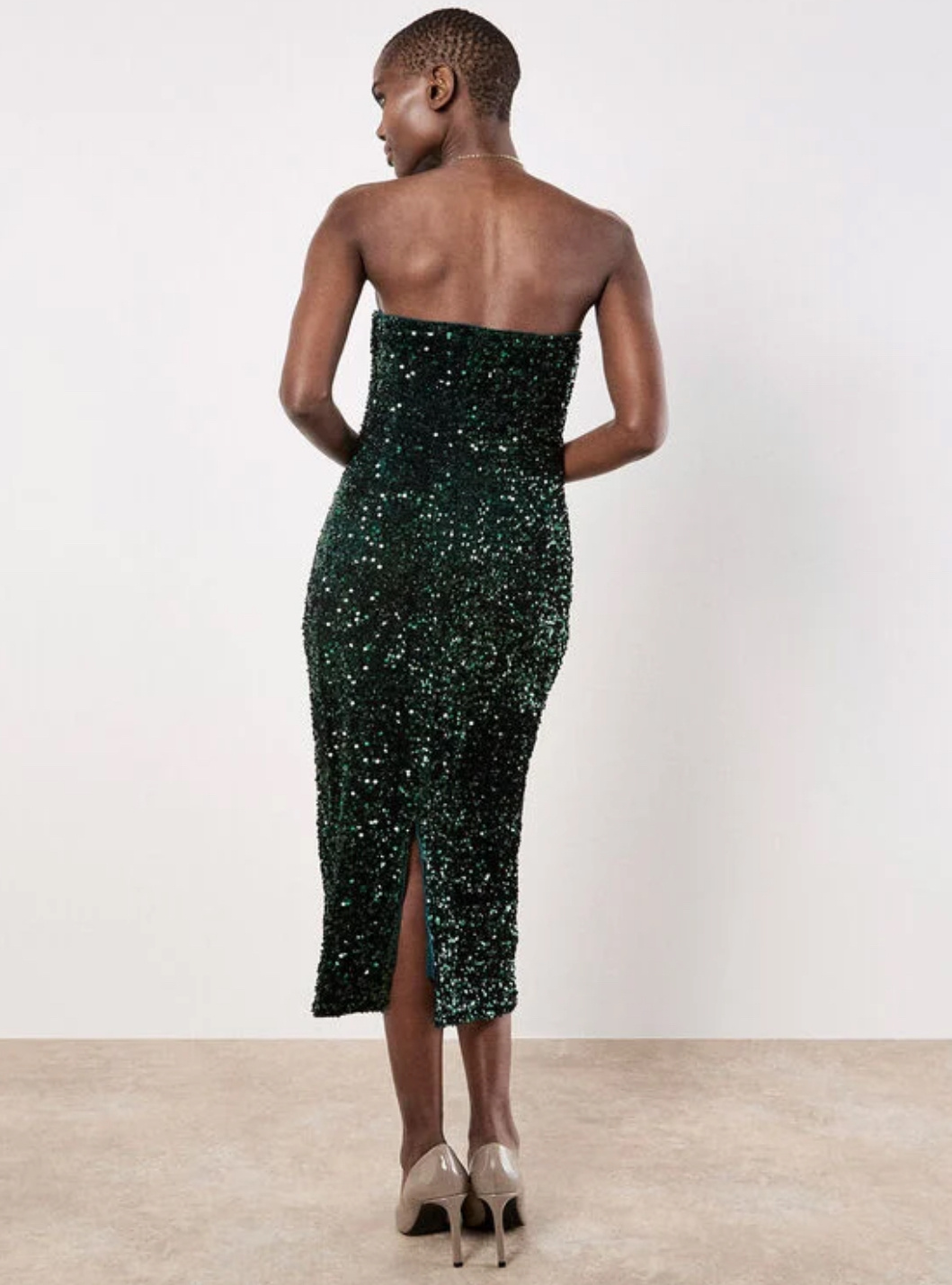 This figure-hugging midi dress is an elegant option for your next event. Designed in soft velvet adorned with shimmering sequins, it’s lined for comfort and boasts bandeau styling and a stretch bodice for the perfect fit.