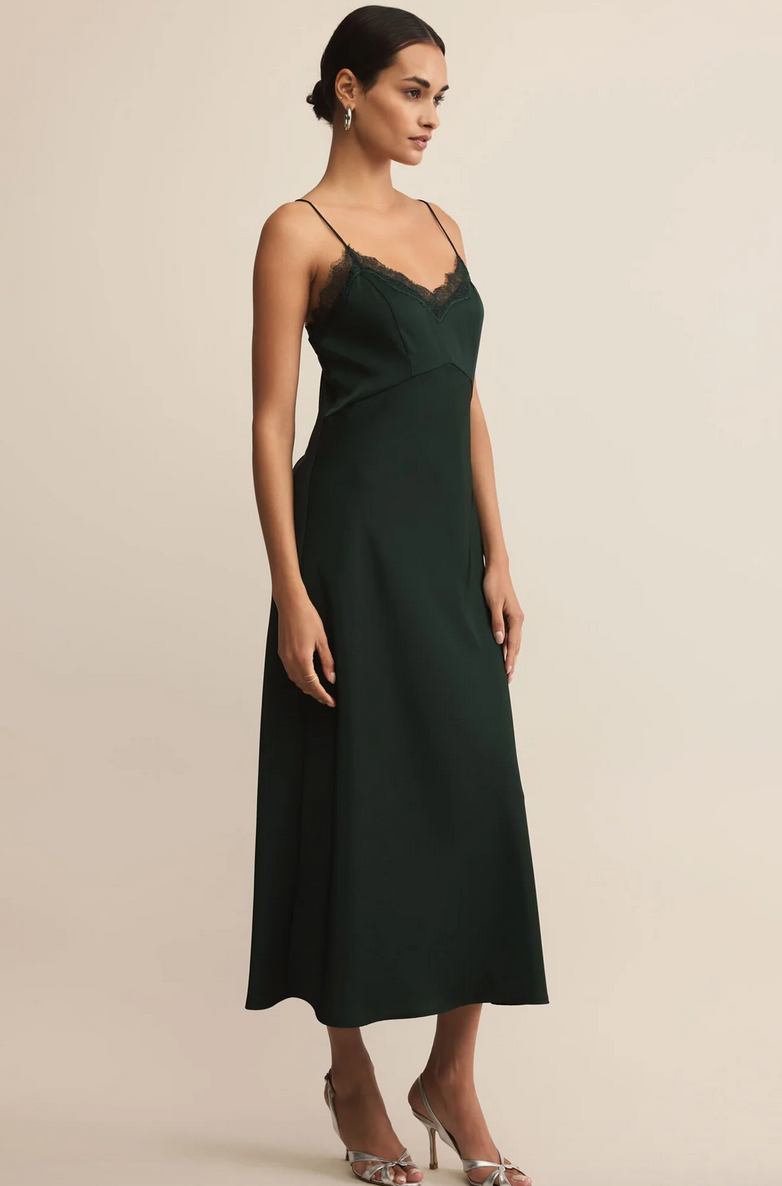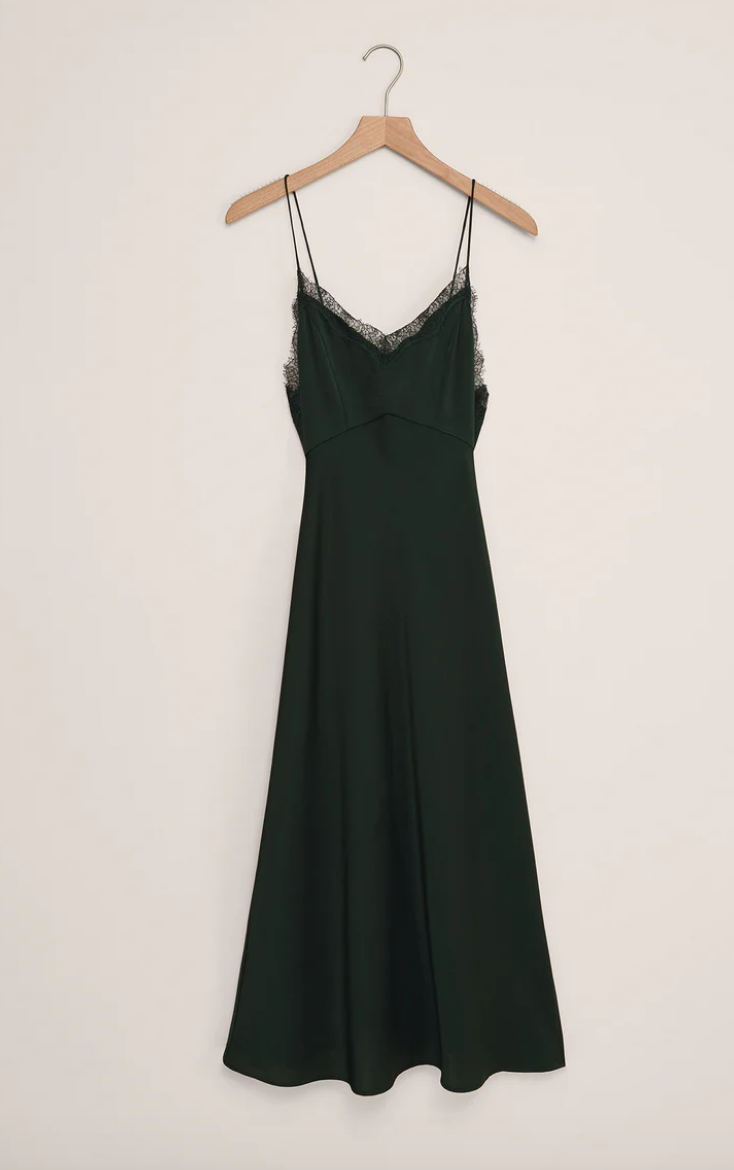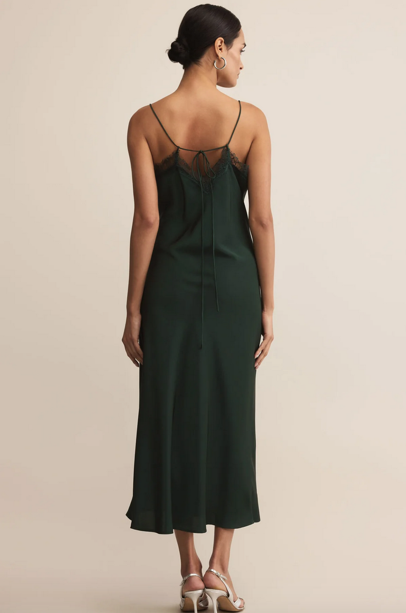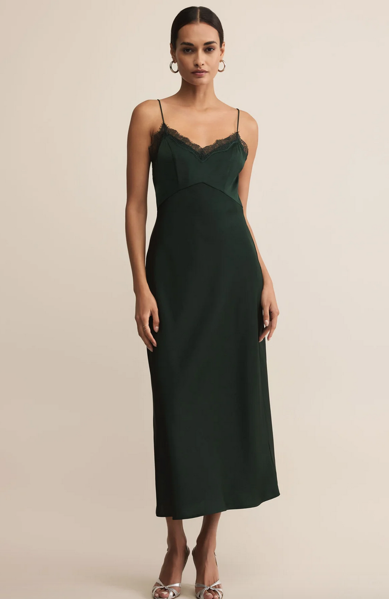 Romantic and refined, this satin midi dress features a v-neckline, lace trim, and delicate spaghetti straps. The adjustable tie back adds a personalized touch for your most comfortable fit yet.