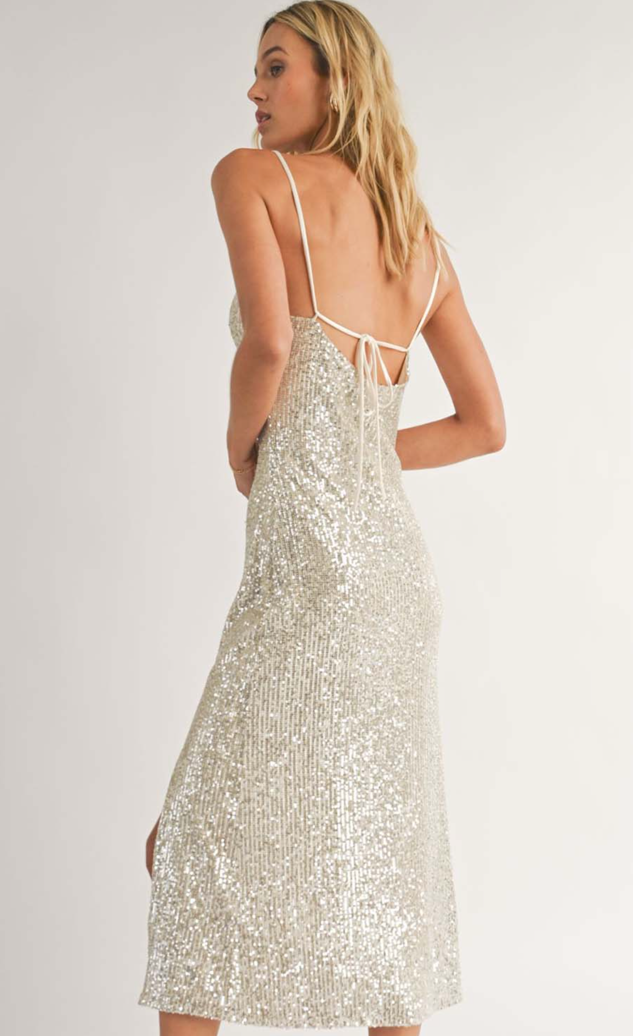 This stunning mid-length dress features a glamorous side slit, delicate spaghetti straps with a tie-back detail, and a flattering V-neck design. Make a statement at any special occasion with this beautiful sequin dress that effortlessly combines elegance