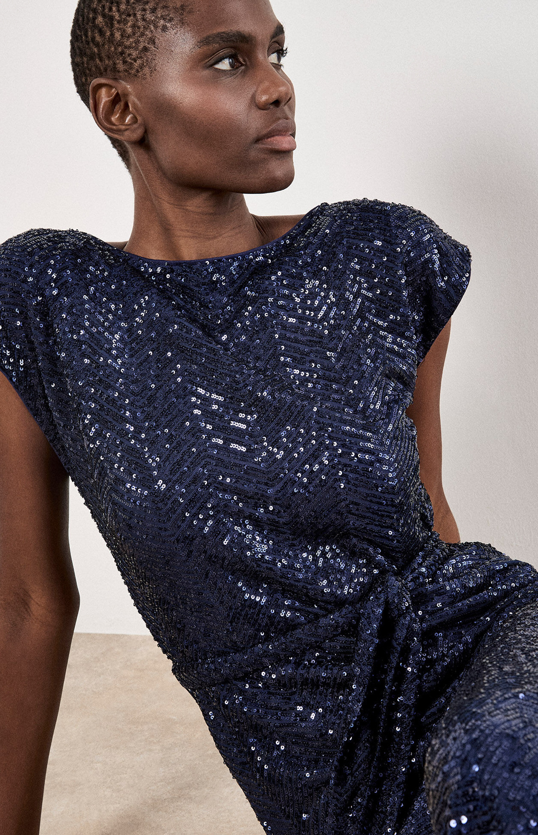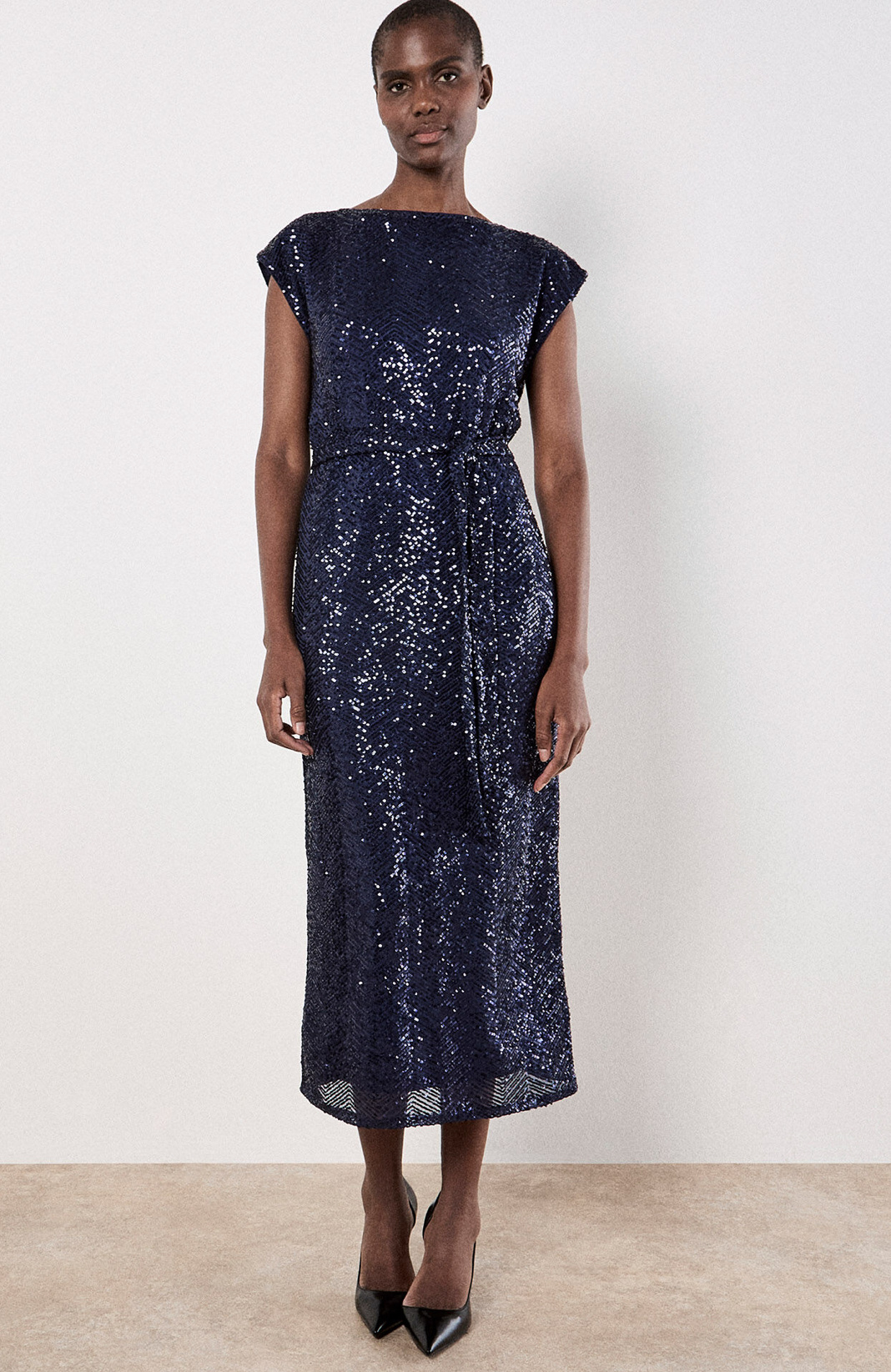 Create an accountElevate your evening wardrobe with this sequin-embellished midi dress. Designed in stretch fabric and lined for comfort, this sparkly midi boasts a fabric belt to create a flattering fit, a keyhole fastening at the nape, and a split hem for ease of movement. Style this sequin midi dress with heels and a clutch for your next event.