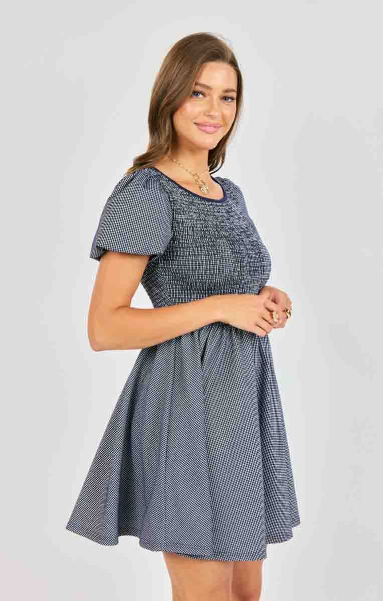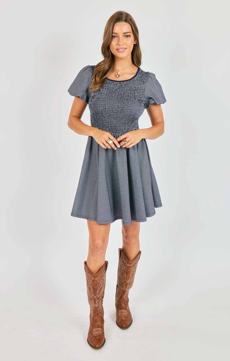 Navy and white mini dress perfect for any event or day to day! Pair this with a dress shoe or sweet simple ballet flat. The top of this dress is super comfy and fitted with its complete elastic smocked bodice.