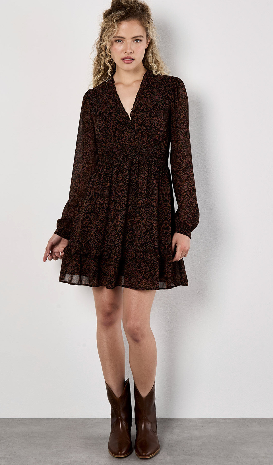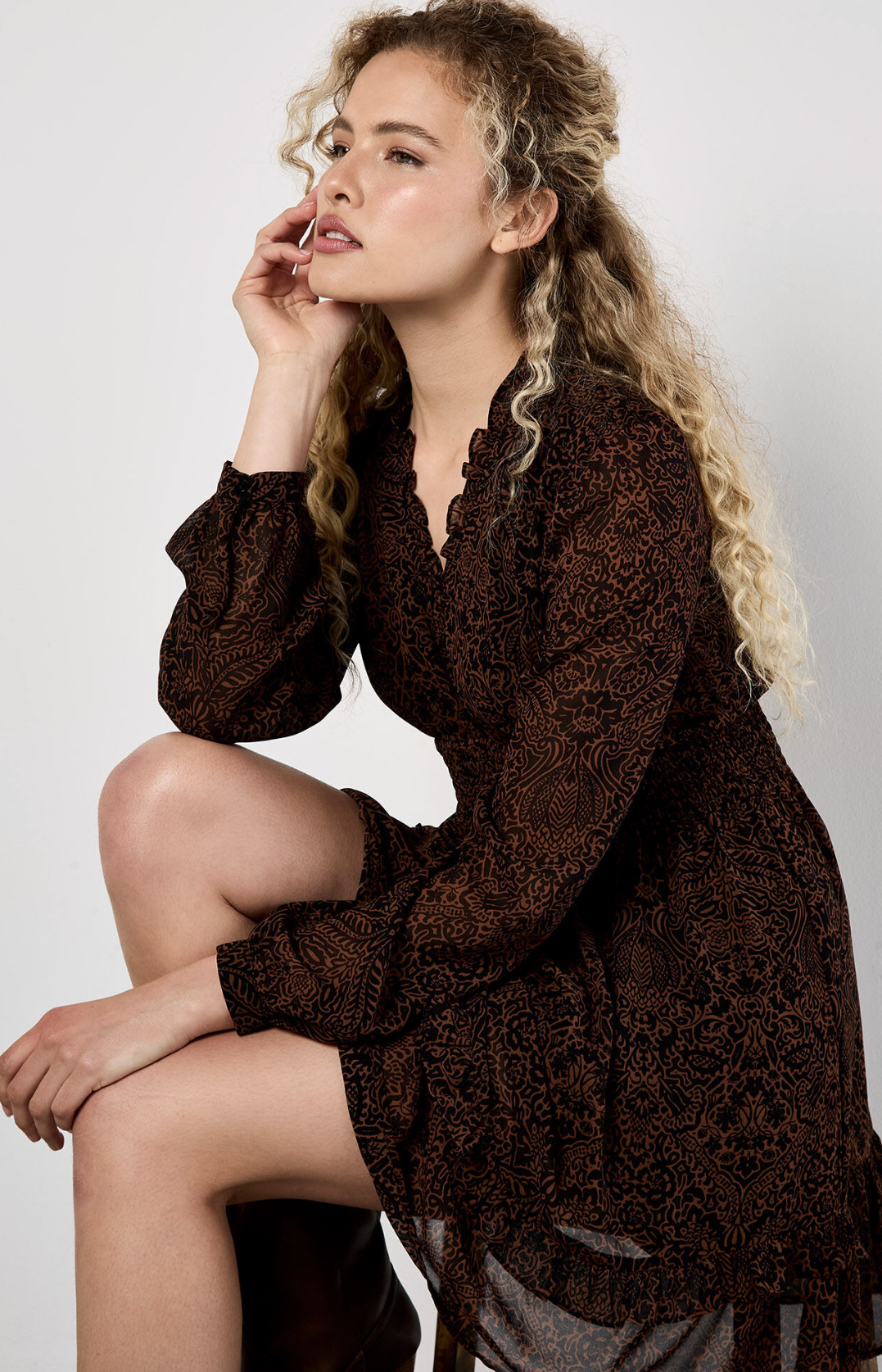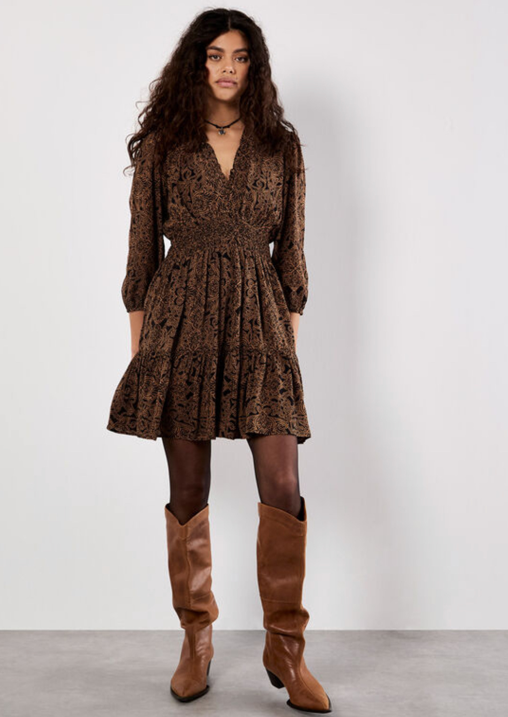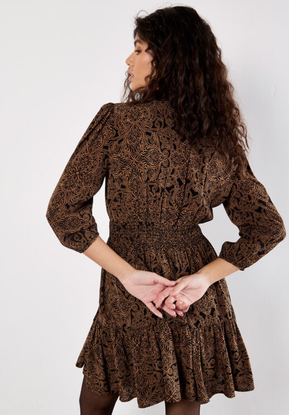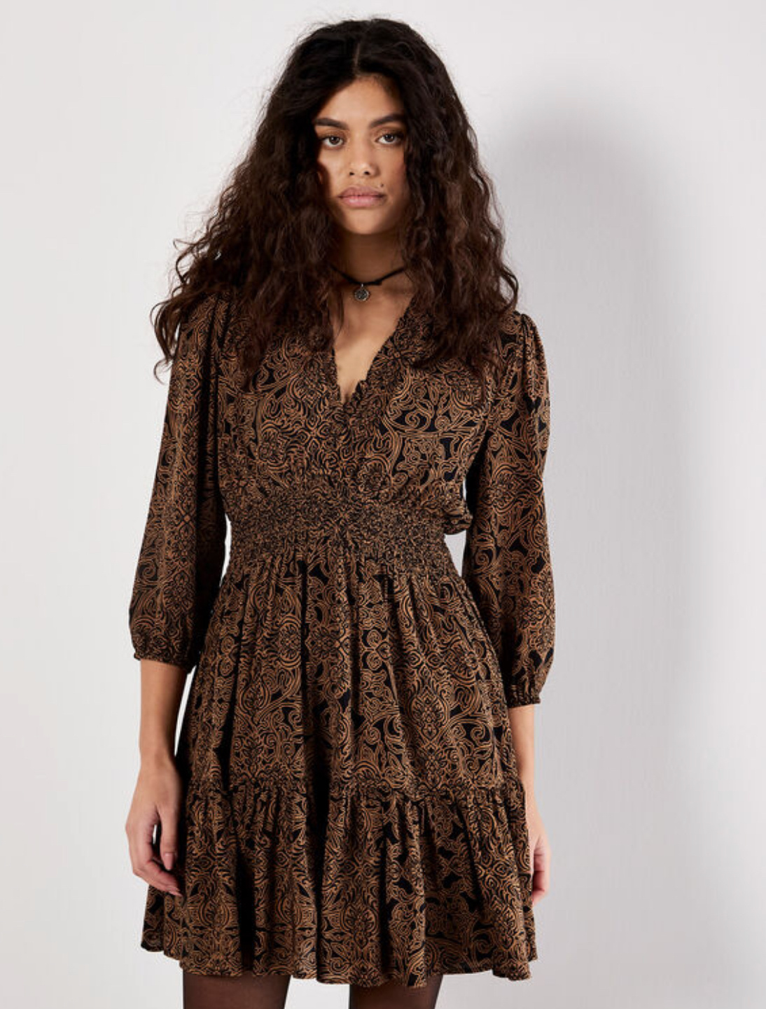 Work timeless print into your wardrobe with this Art Deco-inspired mini. Woven from an ultra-soft fabric and lined for comfort, it boasts cropped balloon sleeves, a ruffle V-neck, and a smocked empire waist for a flattering fit. It's finished with a tiered hem to create a playful sense of movement. Style it with ankle boots for a polished finish.