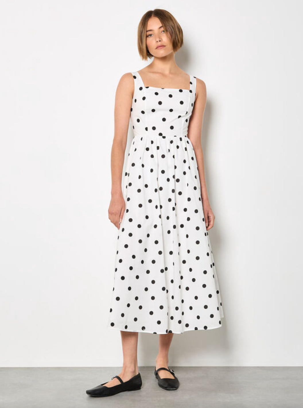 Create an accountElevate your occasionwear wardrobe with this timeless polka dot dress. Designed in a lightweight, woven fabric with a flattering A-line cut, it’s lined for comfort and features a square neck, sleeveless styling, and a smocked back for the perfect fit. Style this polka dot midi dress with heeled wedges and a clutch for garden parties, gatherings, and warm-weather events.