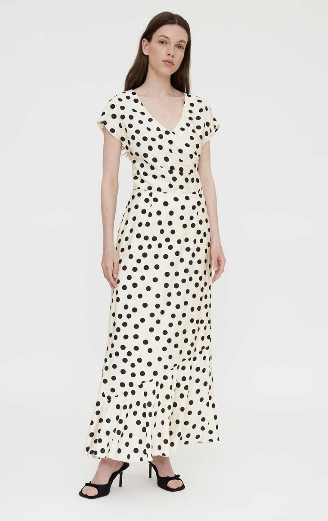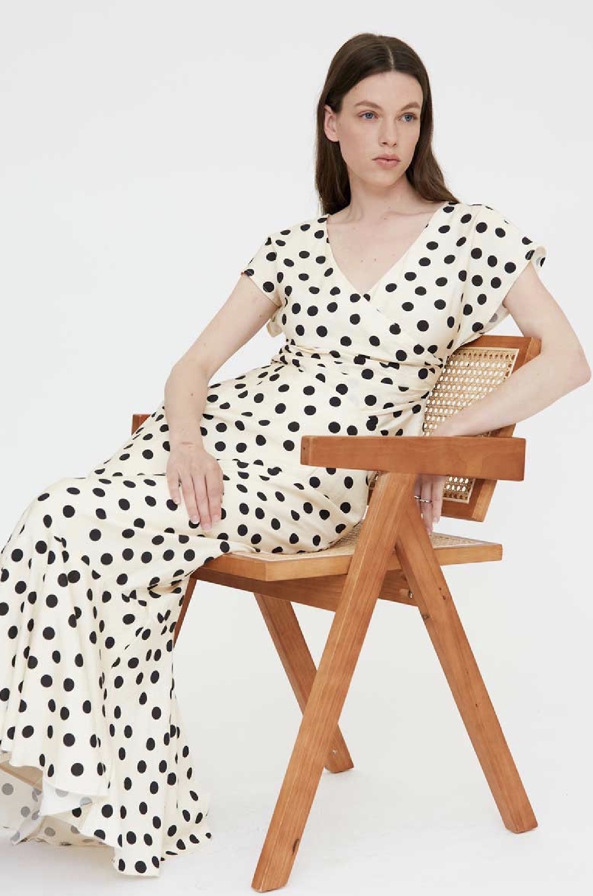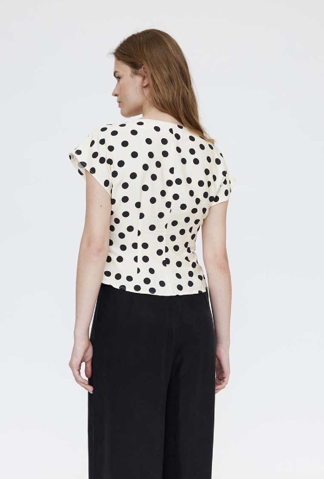 Create an accountTop in crepe knit fabric with an irregular black and white polka dot print. V-neck and crossover neckline with short sleeves.