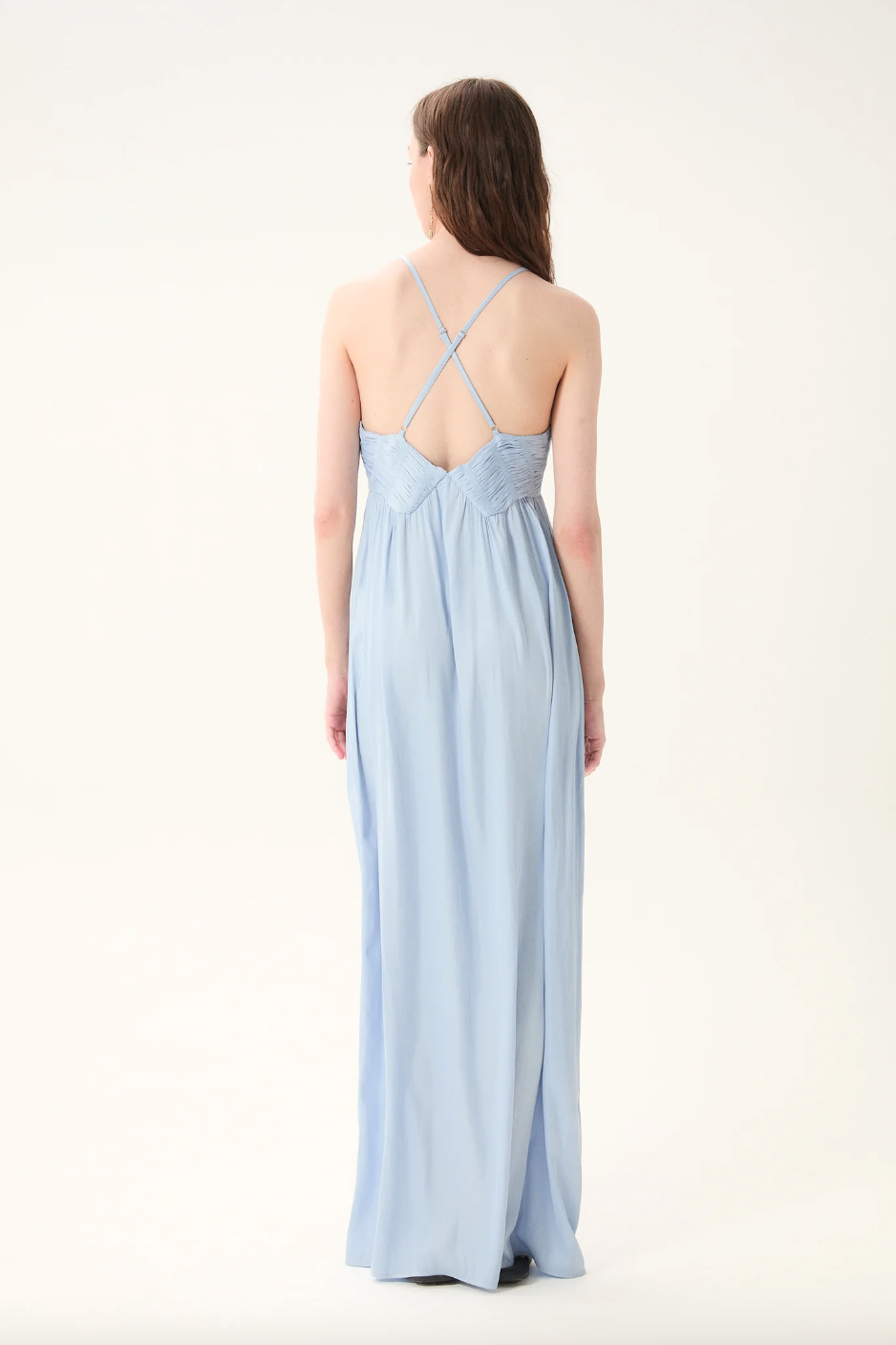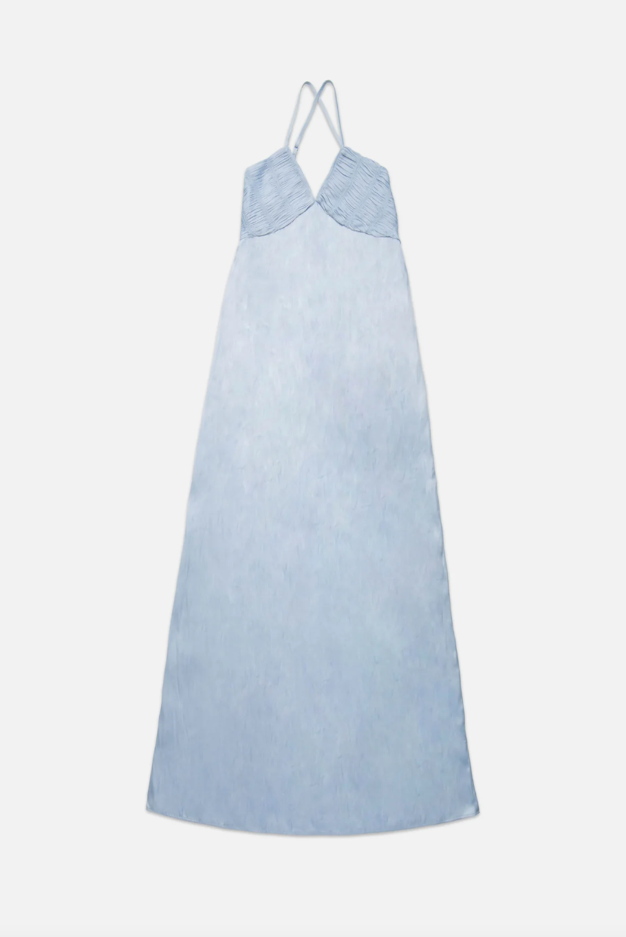 Create an accountSilky sleeveless maxi dress with a V-neckline and adjustable shoulder straps that cross at the back. Designed with two pleated bust panels that extend into the back for a flattering, sculpted fit. Finished with a clean, straight silhouette that falls to a full-length hem, allowing fluid movement without excess volume.
