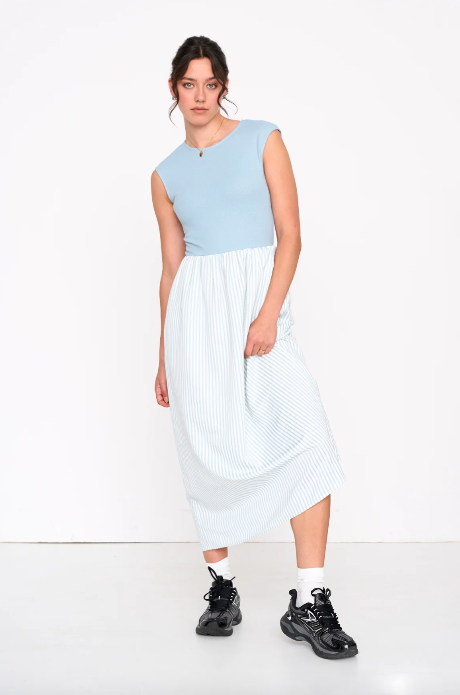 Create an accountFrolick the Summer away in this sweet midi dress with ribbed stretch top and contrasting stripe skirt.