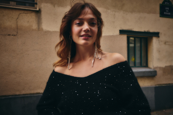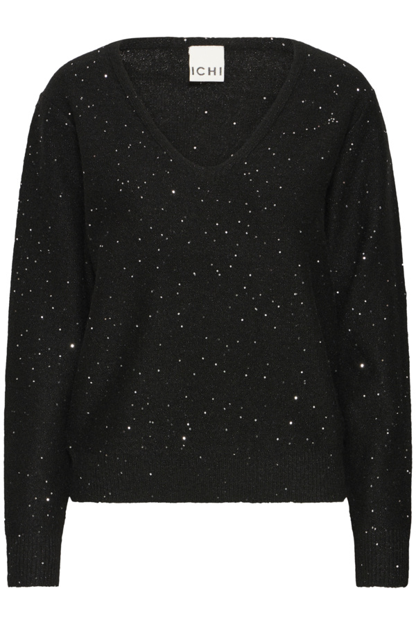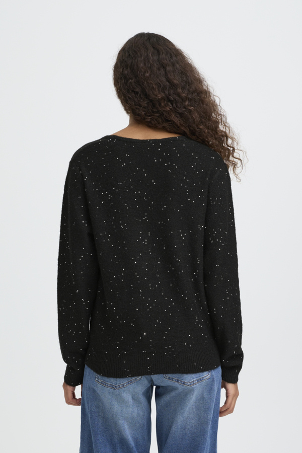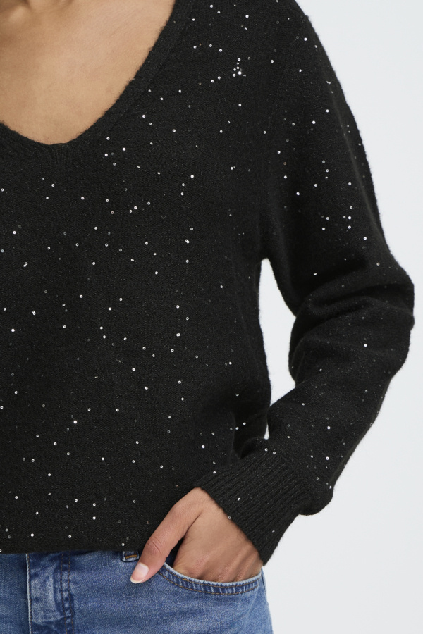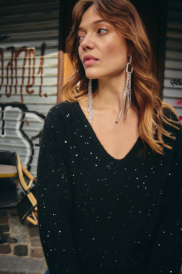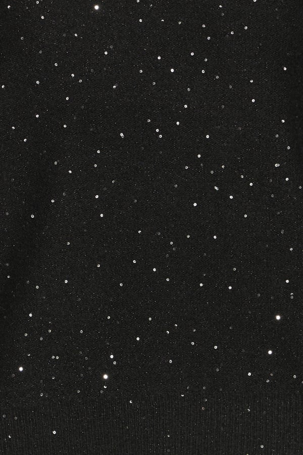 V-neck knit with sequins all over. This can be worn backwards too so you have the V in the back. Slightly itchy.